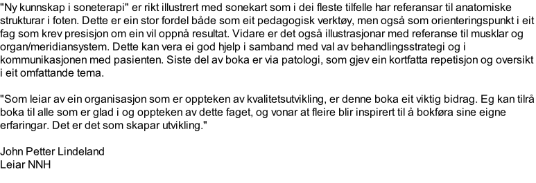 I denne boken finner du detaljerte illustrasjoner av soneterapibehandlingen. Her er det bilder og tekst sammen som sammen leder deg gjennom behandlingen av hele kroppen. Illustrasjonene er hele tiden satt i en anatomisk og fysiologisk sammenheng. I denne nye utgaven av boken, er det i tillegg lagt inn nye illustrasjoner av effektive behandlingspunkter av nedre del rygg og bekken. I slutten av boken finner du oversikter over sone og akupunkturpunkter som er på føttene. Boken er super til deg som ønsker å lære mer soneterapi.